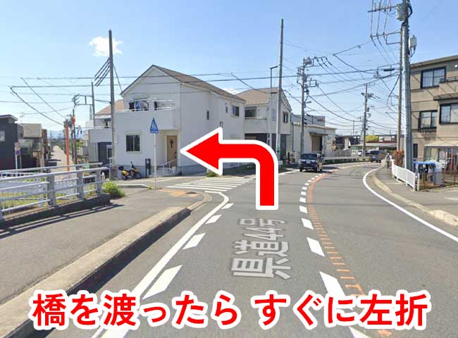 大山街道”藤沢方面”からの場合「県道45号線」「大曲橋」を渡るとすぐに左折し、久保田工務店さんの手前を左折してください。